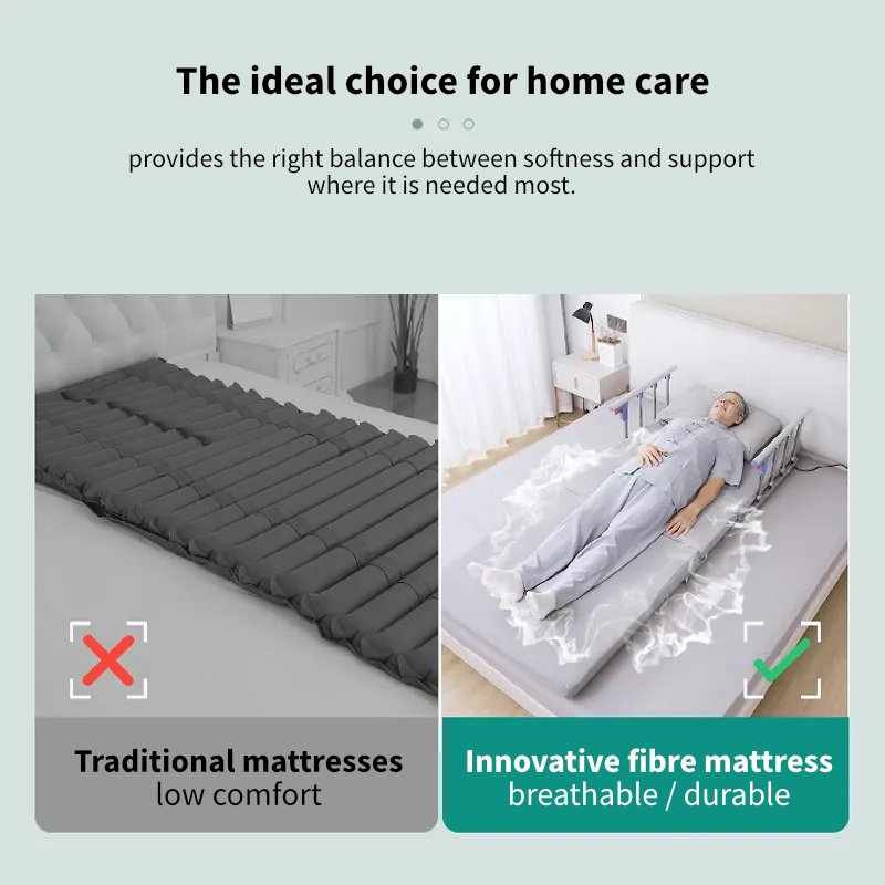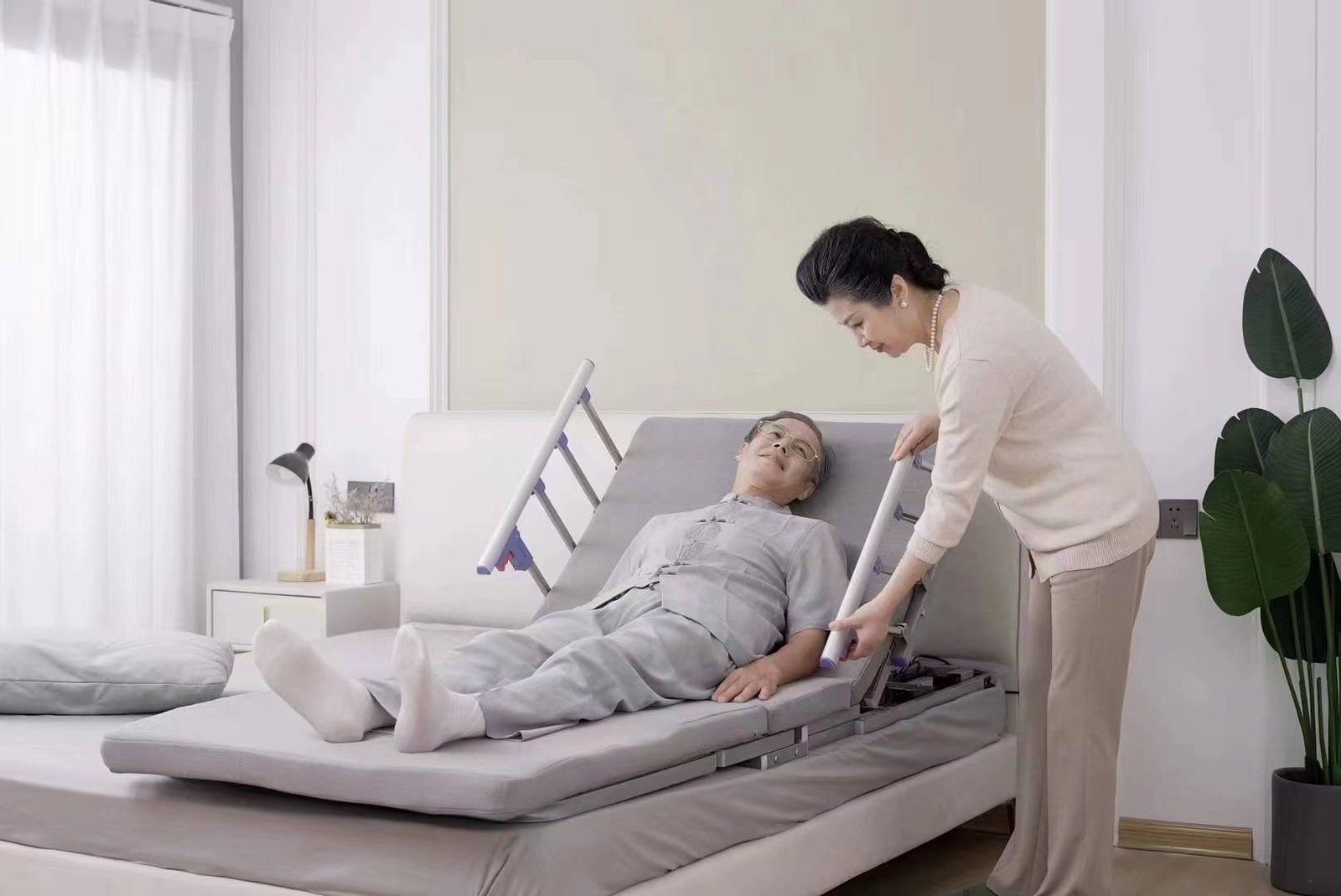 Задня частина ліжка може регулюватися в діапазоні від 0° до 75°, а ножна частина може підніматися в діапазоні від 0° до 45°. Ця функція допомагає пацієнту знайти зручне положення, запобігає виникненню пролежнів і покращує кровообіг. Ліжко також оснащене підйомним механізмом, який допомагає пацієнту вставати з ліжка без сторонньої допомоги. Інноваційний волокнистий матрац забезпечує більший комфорт і підтримку тіла пацієнта. Догляд за пацієнтами з проблемами рухливості, які потребують допомоги при вставанні з ліжка та укладанні в ліжко.